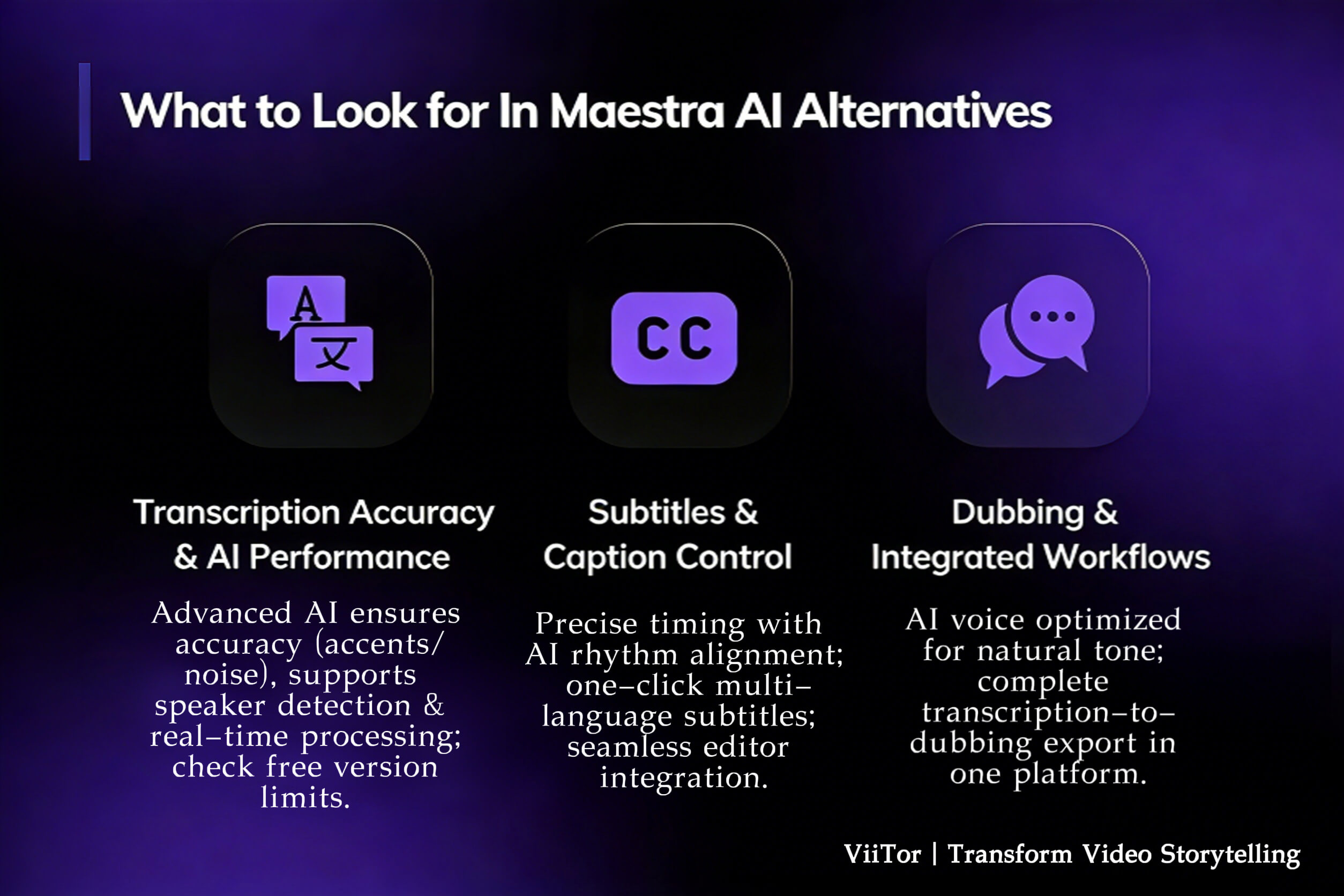 For creators who prioritize dubbed video quality over real-time transcription, ViiTor AI is the most competitive Maestra AI alternative. Both platforms support translation and subtitle generation, but their focus differs. Maestra leans toward real-time captioning, platform integrations, and enterprise workflows, while ViiTor AI specializes in advanced AI video localization with cinematic lip-sync and creative repurposing tools. If you're seeking superior dubbing and lip-sync results, ViiTor AI is the better choice.