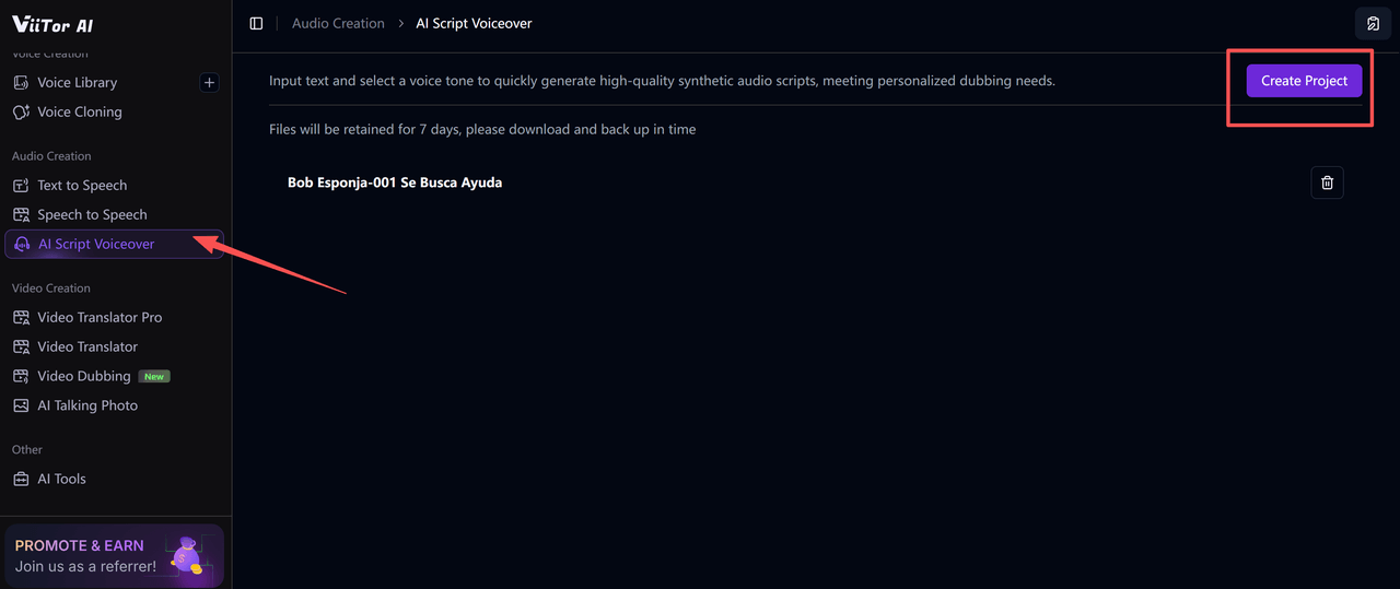 Open ViiTor AI, select AI Script Voiceover, and click Create Project.