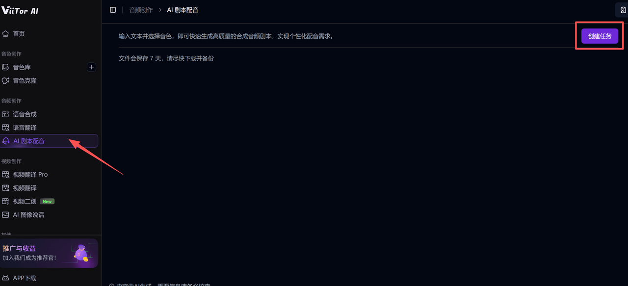 第一步:打开 ViiTor AI,选择【AI 剧本配音】,点击【创建任务】