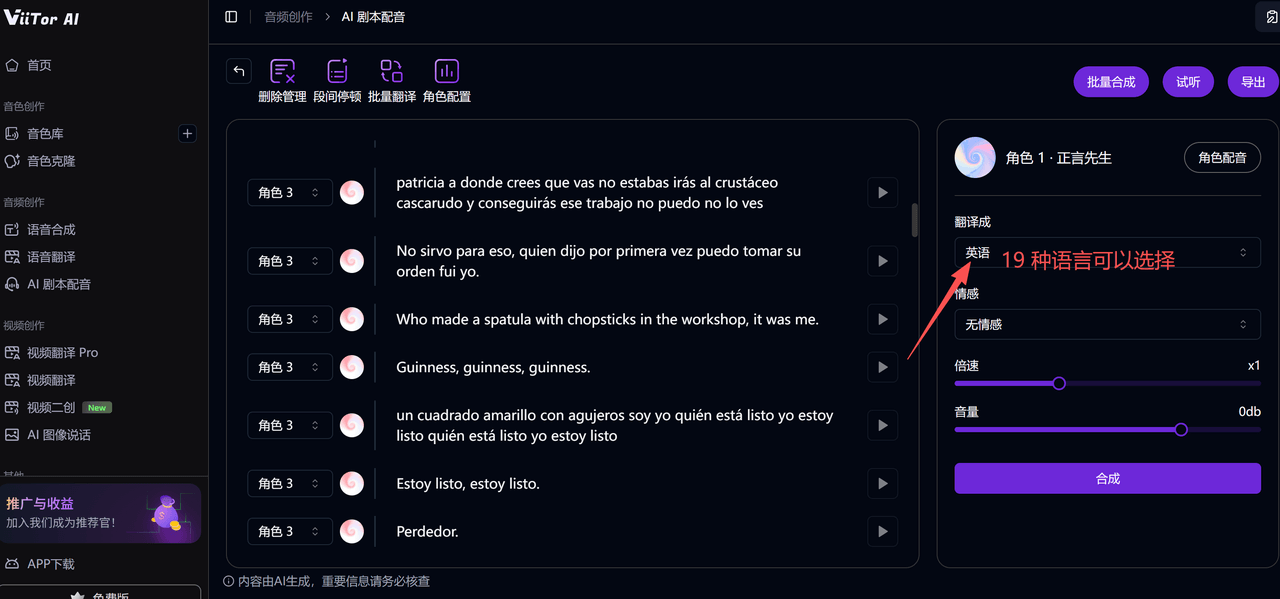 第三步:这里有 19 种语言可以选择,可以点击批量合成以提高效率